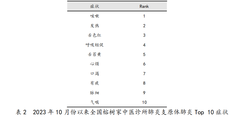 基于榕樹家素靈 AI 輔助診療系統后臺數據(表2、表3),可以發現,榕樹家中醫診所中肺炎支原體肺炎患者 Top 10 癥狀為咳嗽、發熱、舌色紅、呼吸短促、舌苔黃、心煩、 口渴、有痰、脈細和氣喘;常用 Top 10 中藥為甘草、苦杏仁、石膏、麥冬、麻黃、黃芩、連翹、 茯苓、桔梗、金銀花。