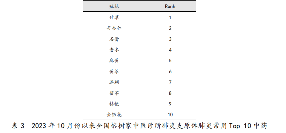 中醫權威專家表示,從常用 Top 5 中藥甘草、苦杏仁、 石膏、麥冬、麻黃來看,其構成就是經典清肺平喘中醫方劑“麻杏石甘湯”,一方面是印證了肺炎支原體肺炎最多證型是風熱閉肺型(毒熱閉肺),另一方面說明臨床麻杏石甘湯對于治療肺炎支原體肺炎有比較大的效果和共識。