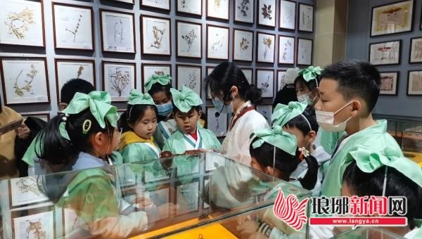 “大家知道這尊塑像是誰嗎?”“李時珍!”在一問一答中,“小藥師”們在沂蒙民間中醫藥文化館中藥博物館里開啟了一場探索之旅。瞬間雀躍的娃娃們仿佛打開了時空大門,學習和認識了古代著名的醫學著作和中醫歷史人物;隔著玻璃打量著仿古藥店模型及古法制藥工具;研究標有人體穴位的銅像,還有各種珍稀藥材。