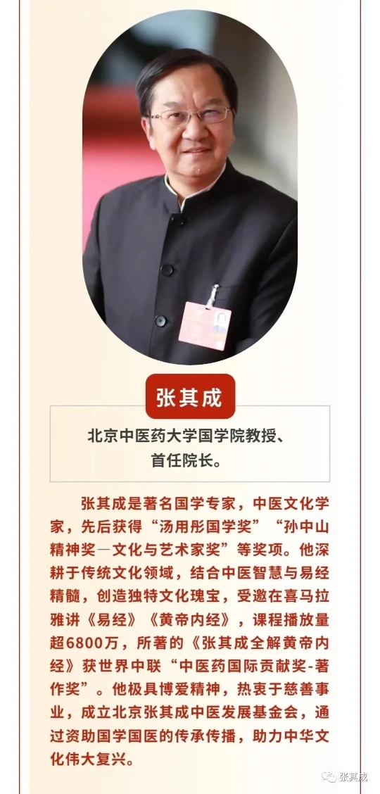 張其成是著名國學專家,中醫文化學家,先后獲得“湯用彤國學獎”“孫中山精神獎—文化與藝術家獎”等獎項。他深耕于傳統文化領域,結合中醫智慧與易經精髓,創造獨特文化瑰寶,受邀在喜馬拉雅講《易經》《黃帝內經》,課程播放量超6800萬,所著的《張其成全解黃帝內經》獲世界中聯“中醫藥國際貢獻獎-著作獎”。他極具博愛精神,熱衷于慈善事業,成立北京張其成中醫發展基金會,通過資助國學國醫的傳承傳播,助力中華文化偉大復興。