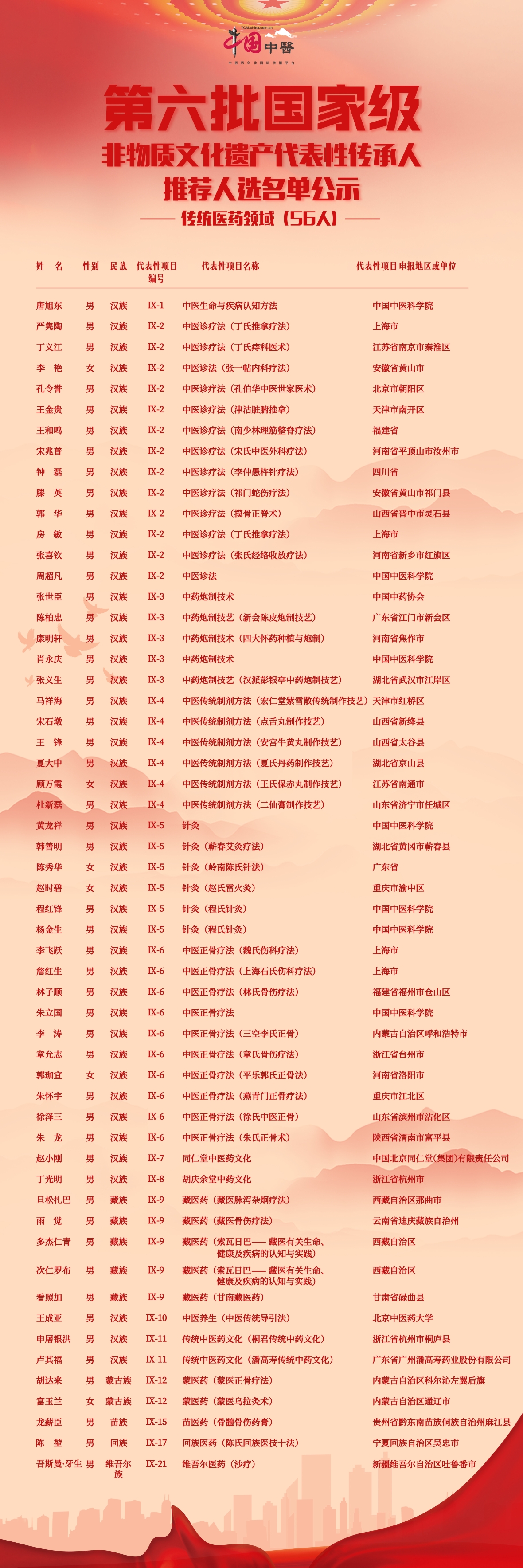 • 第六批國家級非遺代表性傳承人推薦人選名單公示 ?56人入選傳統醫藥項目