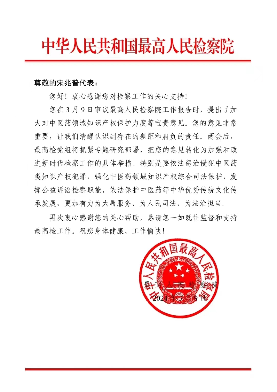 3月9日,全國“兩會”河南團審議最高檢察院工作報告會時,宋兆普就加大中醫藥知識產權保護等問題作大會發言。當晚,最高人民檢察院作出回應:要依法懲治侵犯中醫藥類知識產權犯罪,強化中醫藥領域知識產權綜合司法保護,發揮公益訴訟檢察職能,依法保護中醫藥等中華優秀傳統文化傳承發展。