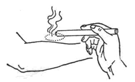 施灸時,艾條點燃的一端與穴位局部保持一定距離,但艾條左右移動或反復旋轉施灸,每處灸10-15分鐘,至皮膚紅暈為度。