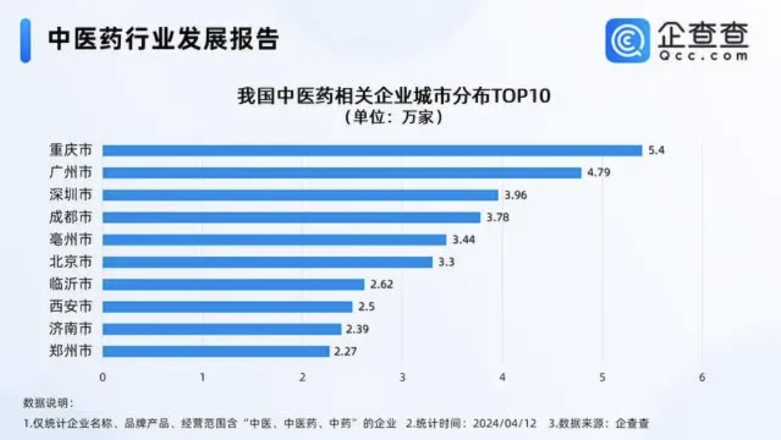 企查查數據顯示,從城市來看,重慶現存5.4萬家中醫藥相關企業,位居第一。廣州、深圳分別現存4.79萬家、3.96萬家,位居前三。此后是成都、亳州、北京等地。