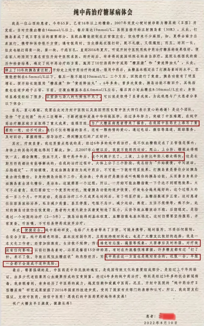 山西太原的王叔叔,今年67歲,2007年突發心梗,經查是糖尿病引發的心臟病變,彼時王叔叔空腹血糖14mmol/L,餐后2h血糖19mmol/L,遵醫囑注射胰島素。然而,注射的痛苦與不便使王叔叔苦不堪言,迫切需要新的治療方法替換胰島素注射。憑借著記者的敏銳,2016年,王叔叔參加了大咖云集的全國內分泌學術年會,在會上結識龐國明教授,并開啟了純中醫治療歷程。