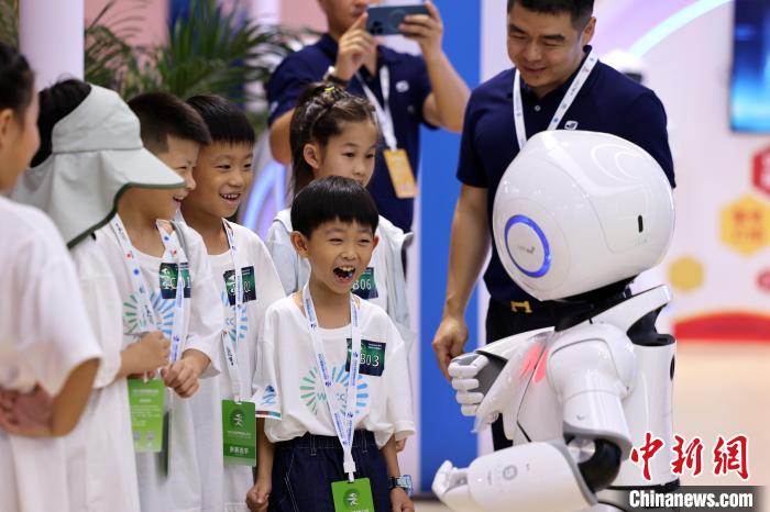 8月21日 2024世界機器人大會在北京開幕 大會以“共育新質生產力共享智能新未來”為主題 圖為小朋友與導覽機器人互動