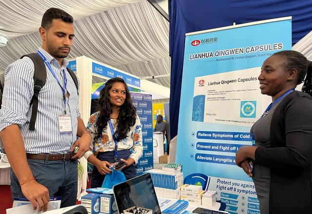 2023年6月,第四十三屆肯尼亞藥師學會年度科學會議參會者在以嶺藥業展臺交流。(受訪者供圖)