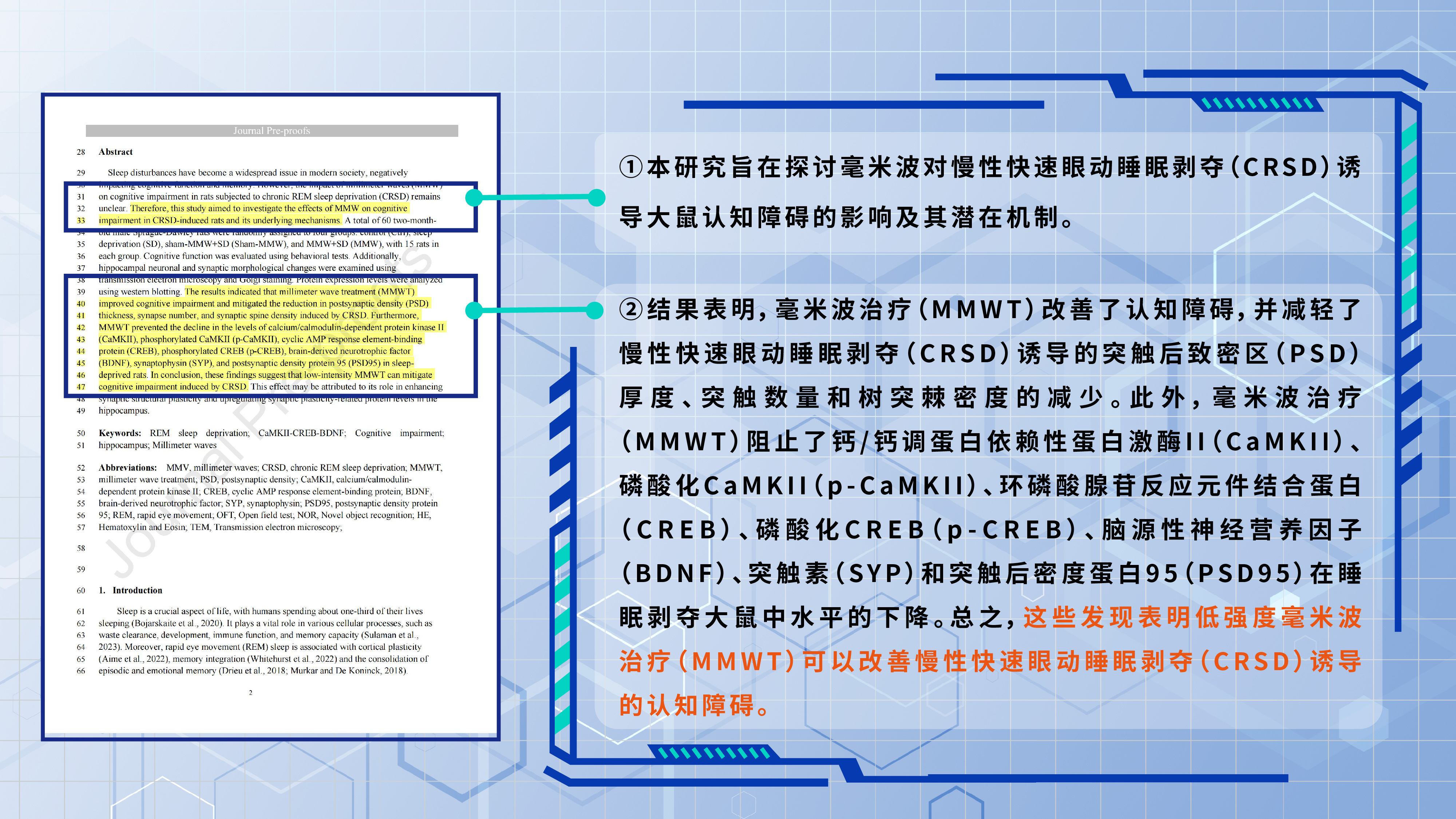 以詳實的數據得出核心結論:“低強度毫米波治療(MMWT)可以改善慢性快速眼動睡眠剝奪(CRSD)誘導的認知障礙。這種效應可能與增強的突觸結構可塑性和對CaMKII-CREB-BDNF信號通路的調節有關?!保ńY論源自論文原文)